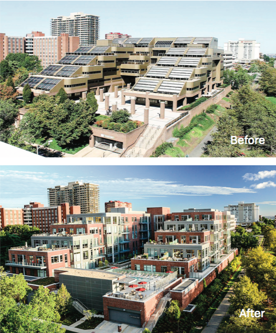 In light of the current economic environment and trends among retail and office occupiers, cities must rethink their policies on commercial development and their existing commercial properties. In recent years, Alexandria has seen several significant office building conversions, including EYA’s stunning conversion of a dated owner-occupied office building on the waterfront (pictured below) and Novus Residences’ revolutionary live-work e-lofts project, a transformation of an old federal government agency office building on the west end of the City.
